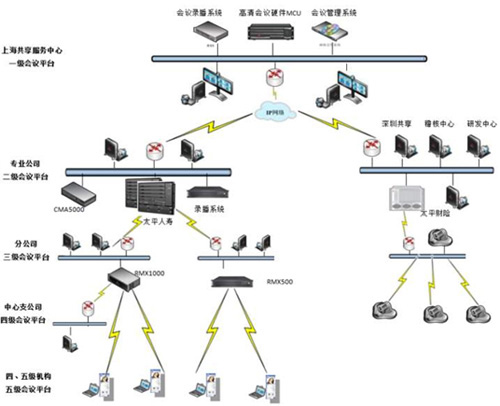 公司視頻會議系統項目自2010年全面啓動,并已完成一期、二期的項目建設,實現太平人壽包括上海總部2個主會場、23個分會場、若幹個中心支會場,以及爲高清視頻會議系統接入、控制和服務的控制中心高清MCU、會議預約管理系統PCMS、會議錄制點播系統建設。如下圖所示,已經形成了共享服務中心,專業公司,省分公司,中心支的四級高清視頻會議系統架構。